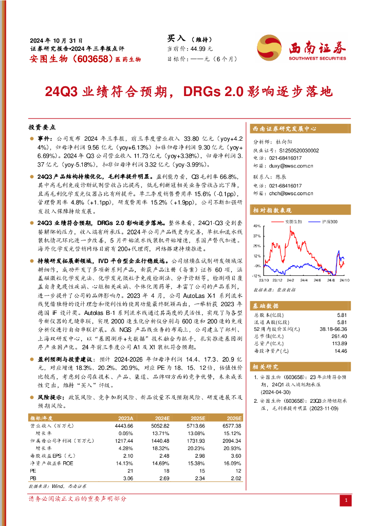 西南证券:安图生物(603658)-2024年三季报点评:24Q3业绩符合预期,DRGs2.0影响逐步落地.pdf