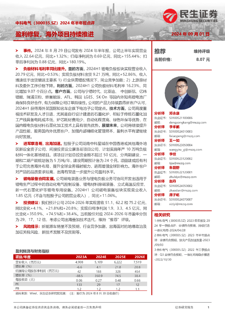 民生证券:中科电气(300035)-2024年半年报点评:盈利修复,海外项目持续推进.pdf