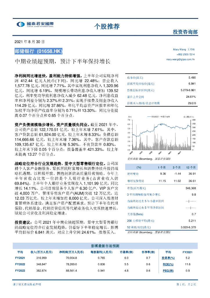 国泰君安证券(香港):邮储银行(01658)港股公司研究报告-中期业绩超预期,预计下半年保持增长.pdf