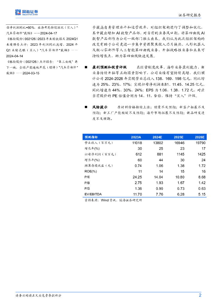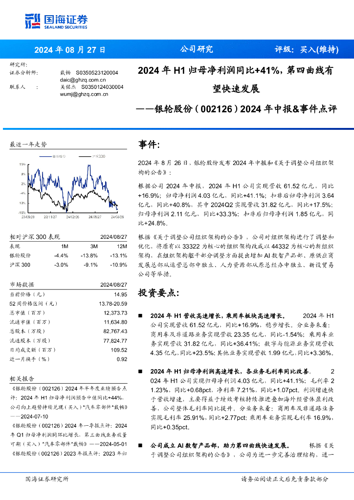 国海证券:银轮股份(002126)-2024年H1归母净利润同比+41%,第四曲线有望快速发展.pdf