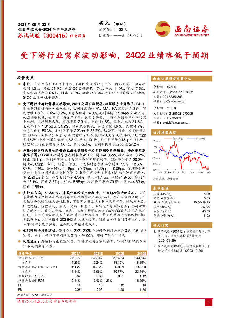 西南证券:苏试试验(300416)-2024年半年报点评:受下游行业需求波动影响,24Q2业绩略低于预期.pdf