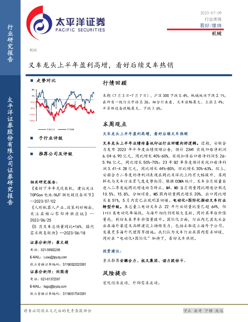 太平洋证券:机械行业周报;叉车龙头上半年盈利高增,看好后续叉车热销.pdf