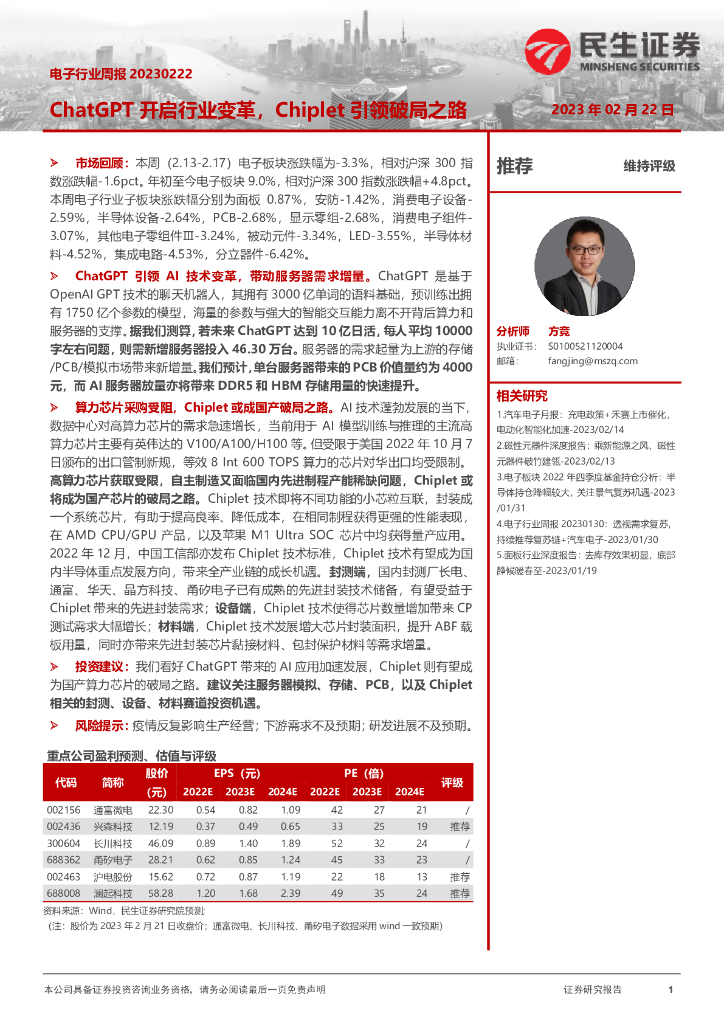 民生证券:电子行业周报:ChatGPT开启行业变革,Chiplet引领破局之路.pdf