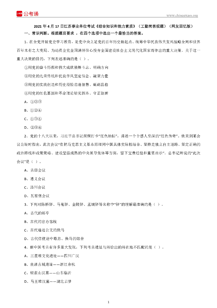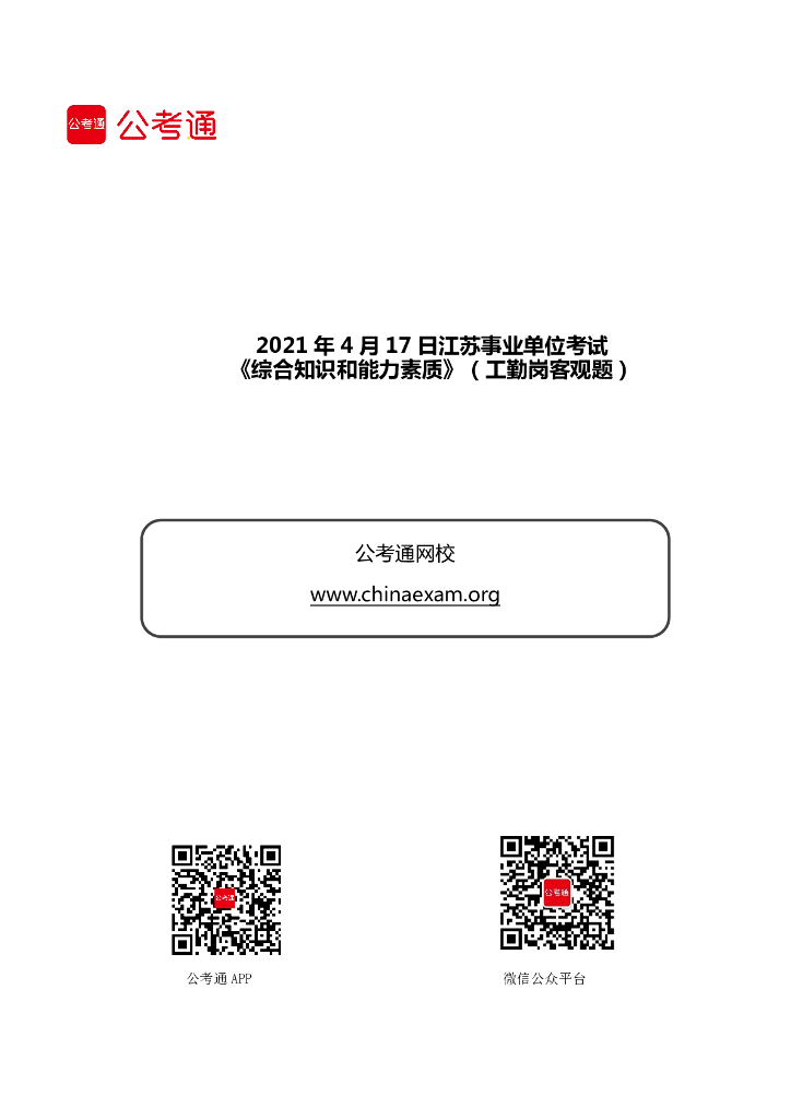 2021年4月17日江苏事业单位考试《综合知识和能力素质》(工勤岗客观题).pdf