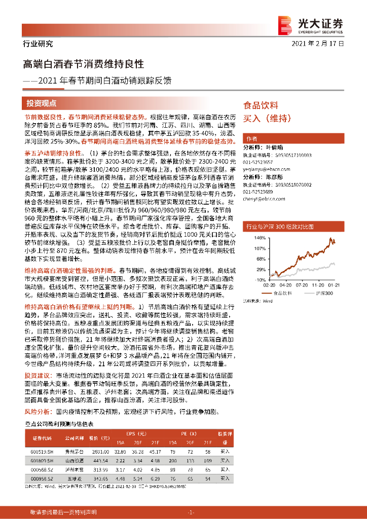 光大证券:食品饮料行业-2021年春节期间白酒动销跟踪反馈:高端白酒春节消费维持良性.pdf