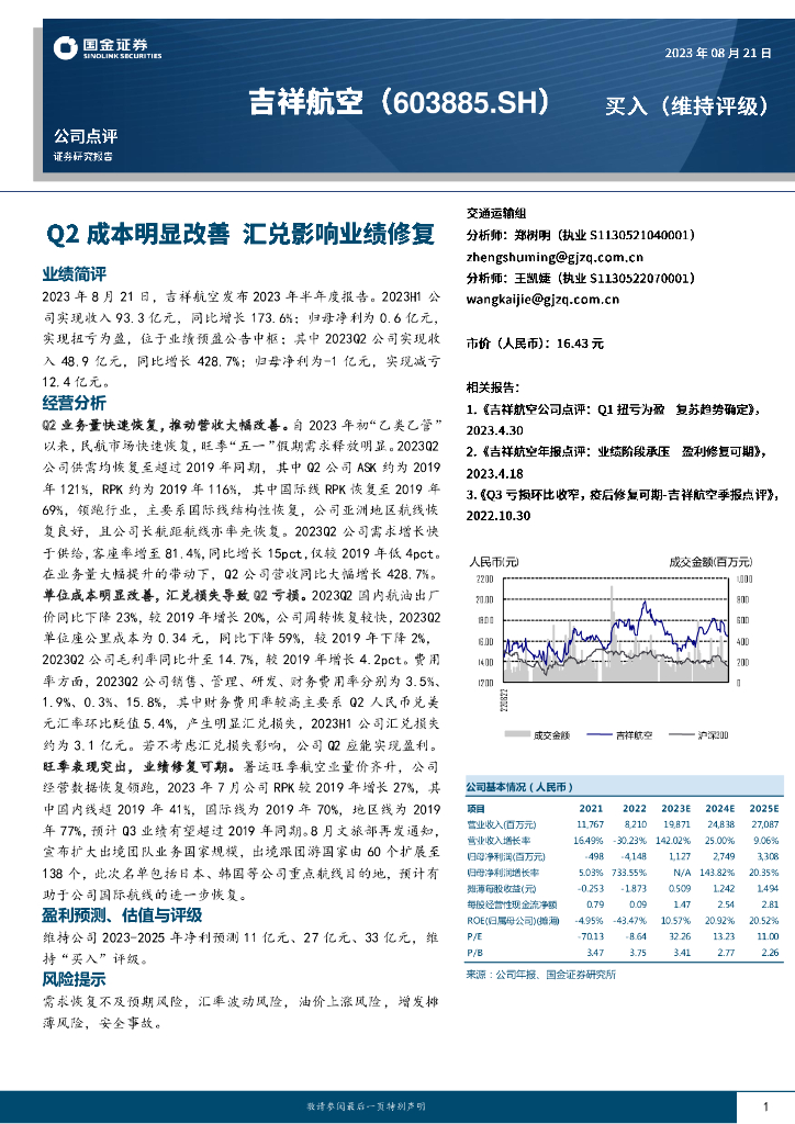 国金证券:吉祥航空(603885)-Q2成本明显改善,汇兑影响业绩修复.pdf