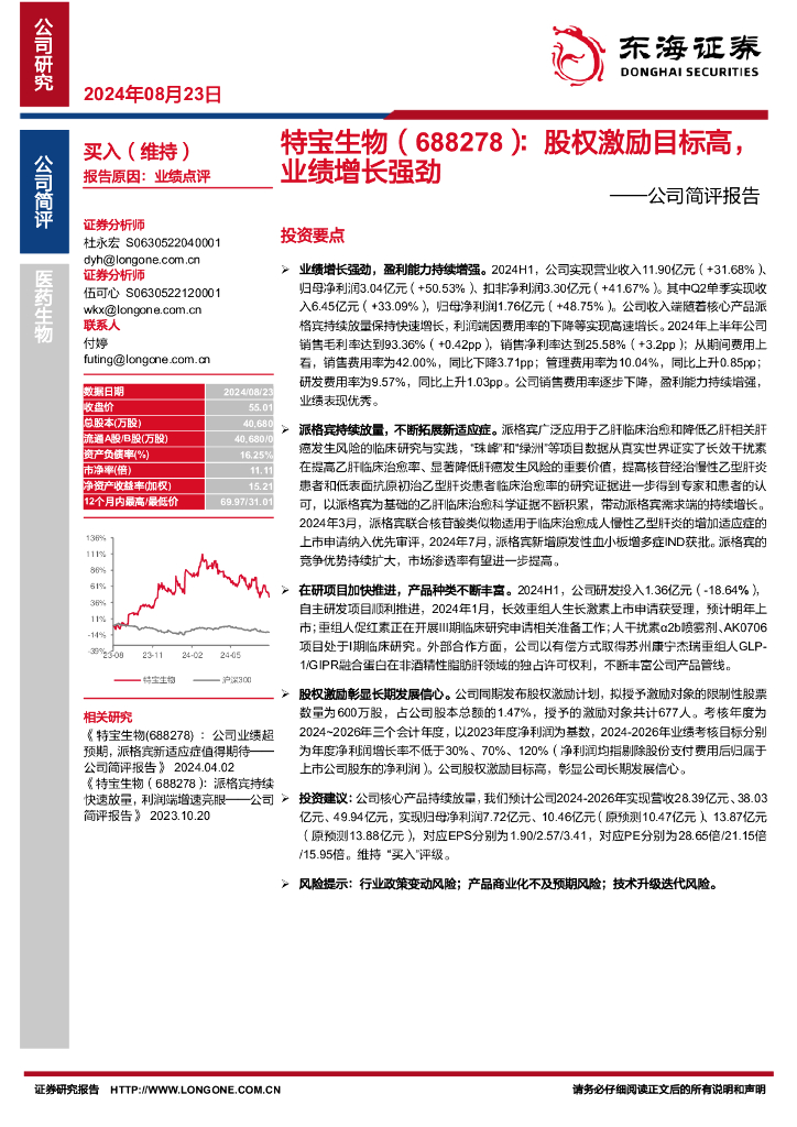 东海证券:特宝生物(688278)-公司简评报告:股权激励目标高,业绩增长强劲.pdf