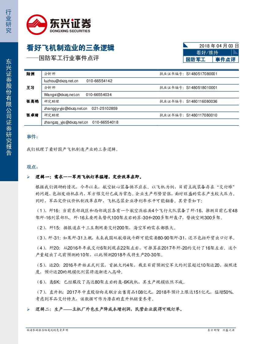 东兴证券:国防军工行业事件点评:看好飞机制造业的三条逻辑.pdf