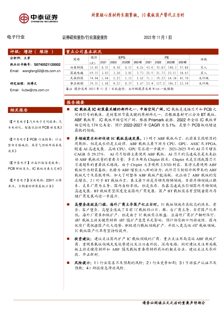 中泰证券:电子行业深度报告:封装核心原材料长期紧缺,IC载板国产替代正当时.pdf