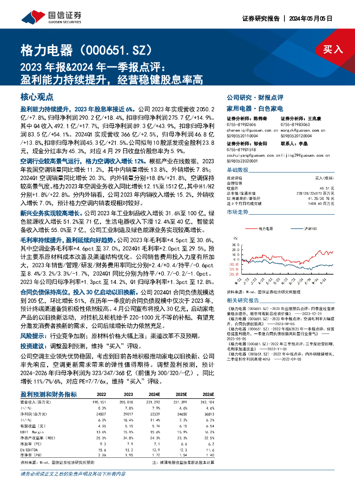 国信证券:格力电器(000651)-2023年报&2024年一季报点评:盈利能力持续提升,经营稳健股息率高.pdf