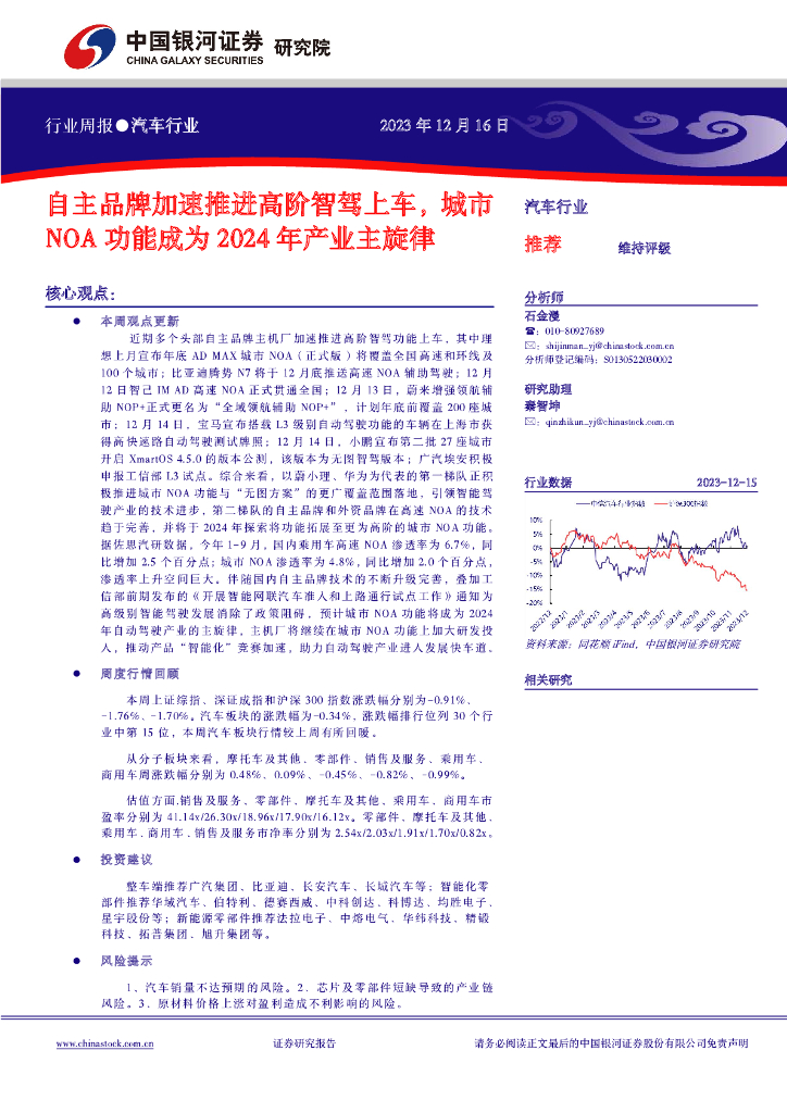 中国银河:汽车行业周报:自主品牌加速推进高阶智驾上车,城市NOA功能成为2024年产业主旋律.pdf
