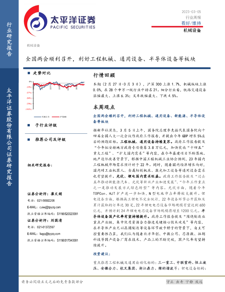 太平洋证券:机械设备行业周报:全国两会顺利召开,利好工程机械、通用设备、半导体设备等板块.pdf