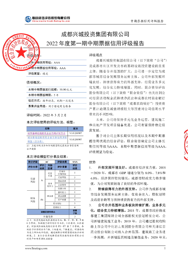 联合资信:成都兴城投资集团有限公司2022年度第一期中期票据信用评级报告及跟踪评级安排.pdf