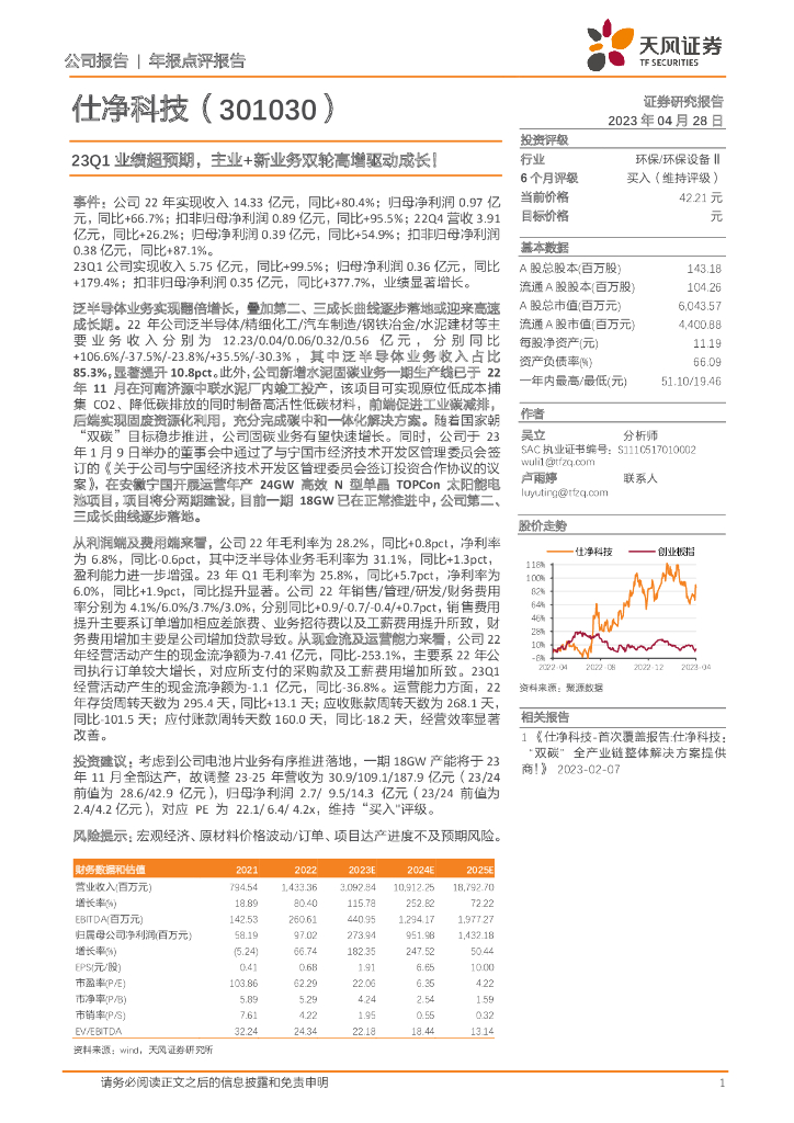 天风证券:仕净科技(301030)-23Q1业绩超预期,主业+新业务双轮高增驱动成长.pdf