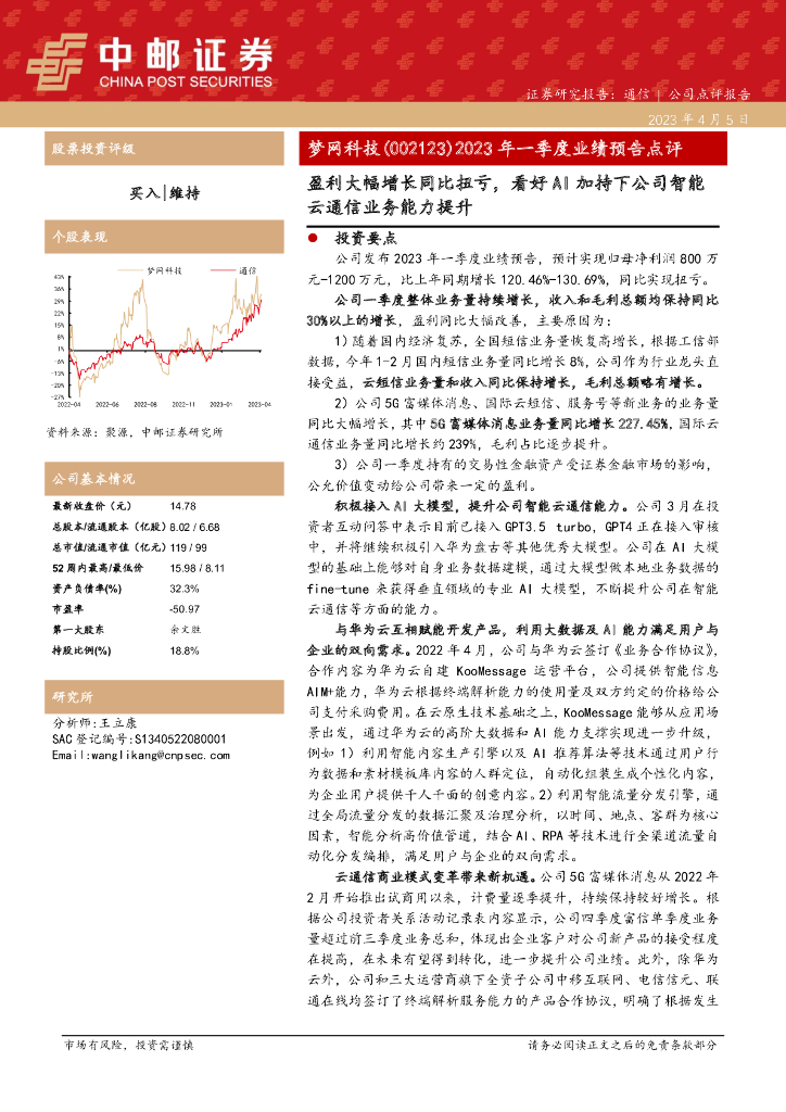 中邮证券:梦网科技(002123)-2023年一季度业绩预告点评:盈利大幅增长同比扭亏,看好AI加持下公司智能云通信业务能力提升.pdf