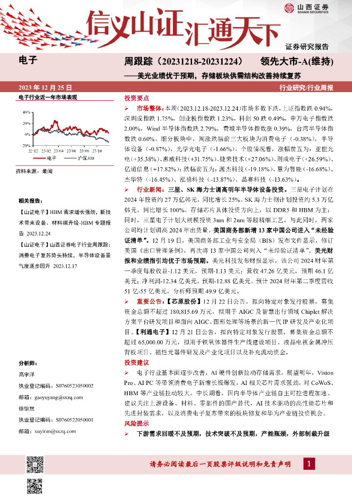 山西证券:电子周跟踪:美光业绩优于预期,存储板块供需结构改善持续复苏.pdf