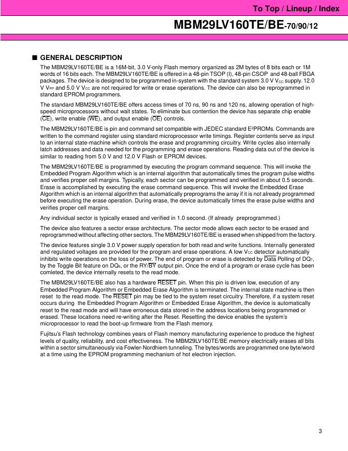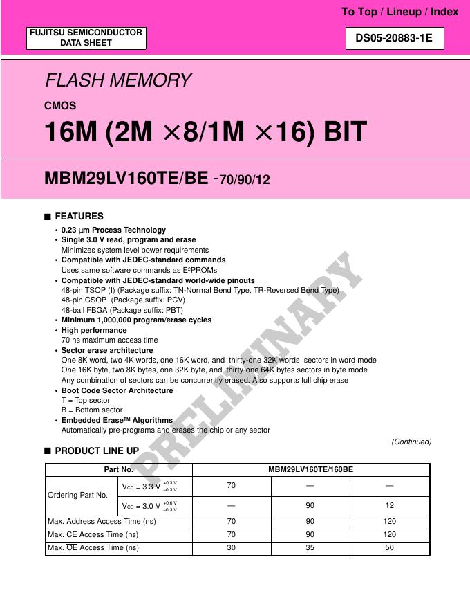 FUJITSU SEMICONDUCTOR FLASH MEMORY CMOS 16M (2M × 8/1M × 16) BIT MBM29LV160TE/BE -70/90/12 数据手册.pdf