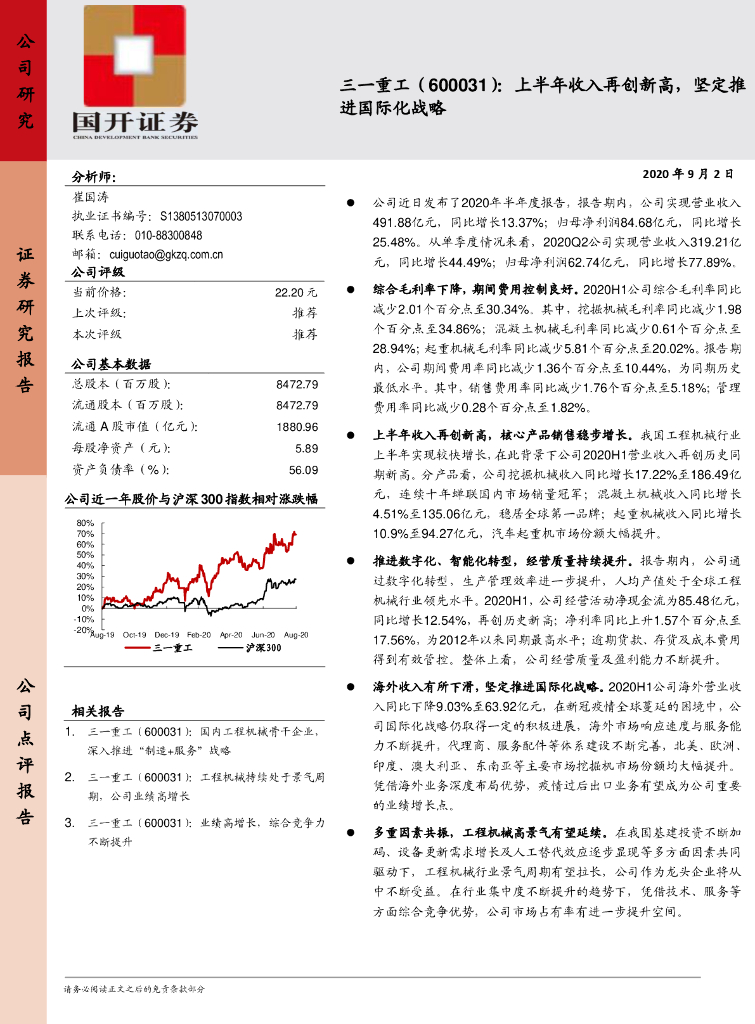 国开证券:三一重工(600031)-上半年收入再创新高,坚定推进国际化战略.pdf
