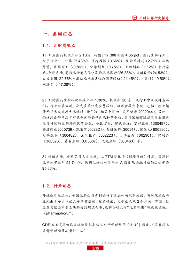 川财证券:医药生物行业周报:医药高位震荡,关注中报业绩确定性.pdf