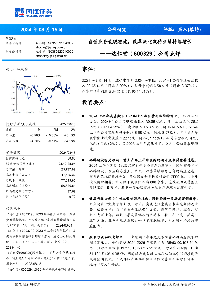 国海证券:达仁堂(600329)-公司点评:评级:买入(维持)自营业务表现稳健,改革深化期待业绩持续增长.pdf