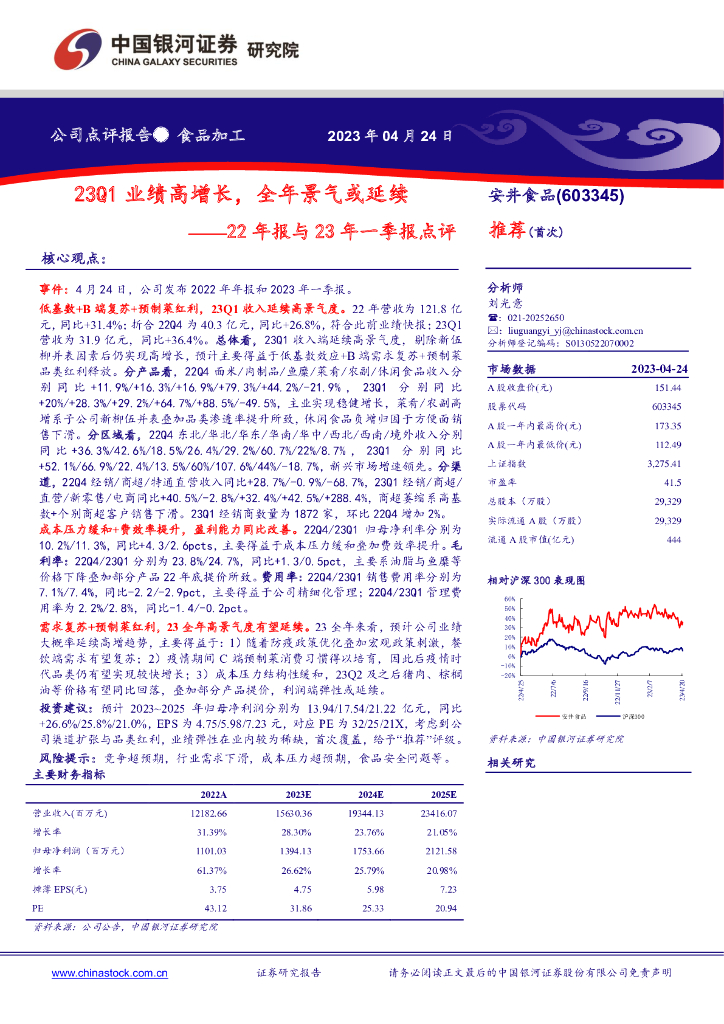 中国银河:安井食品(603345)-22年报与23年一季报点评:23Q1业绩高增长,全年景气或延续.pdf