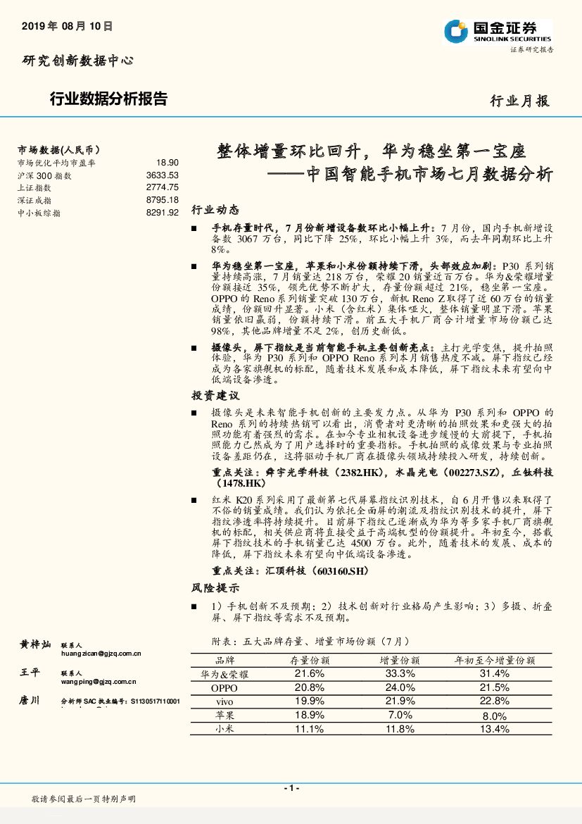 国金证券:中国智能手机市场七月数据分析:整体增量环比回升,华为稳坐第一宝座.pdf