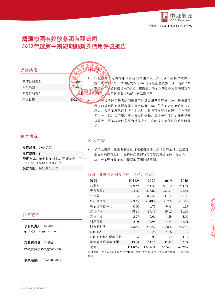 鹏元:鹰潭市国有控股集团有限公司2022年度第一期短期融资券信用评级报告.pdf