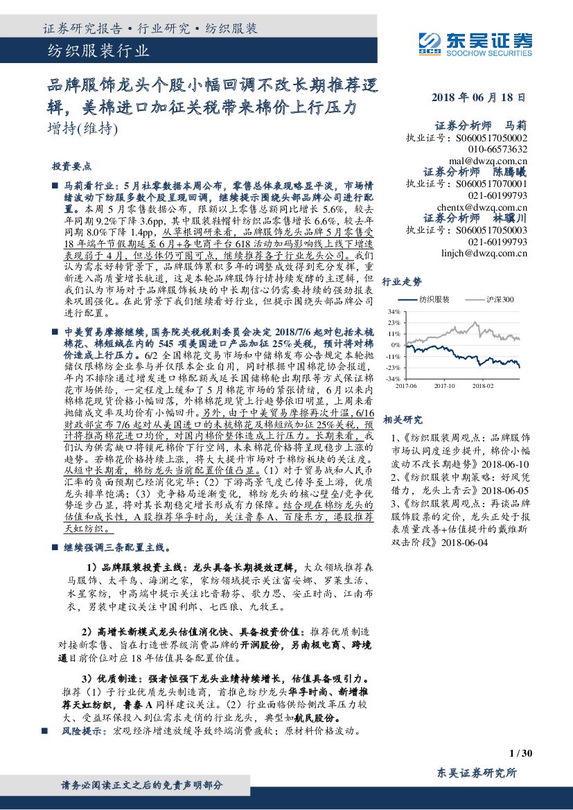 东吴证券:纺织服装行业:品牌服饰龙头个股小幅回调不改长期推荐逻辑,美棉进口加征关税带来棉价上行压力.pdf