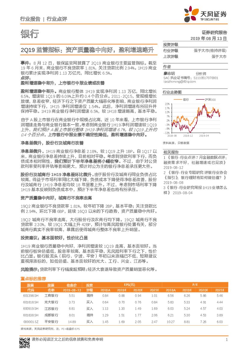 天风证券:银行2Q19监管指标:资产质量稳中向好,盈利增速略升.pdf