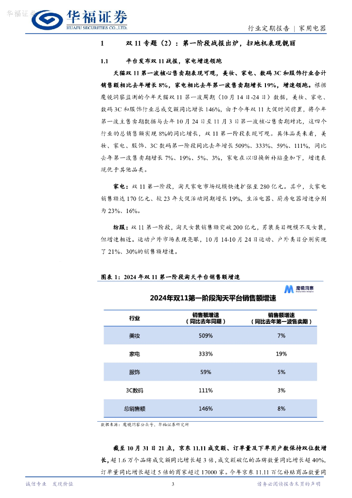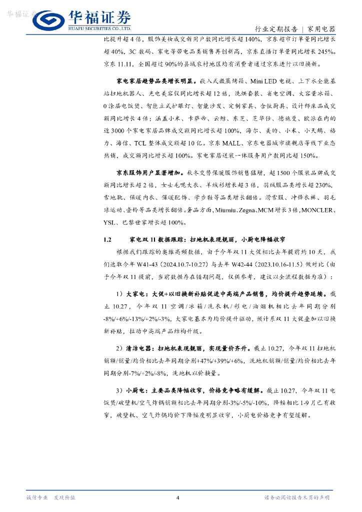 华福证券:家用电器行业24W44周观点:双11专题(2),第一阶段战报出炉,扫地机表现靓丽.pdf