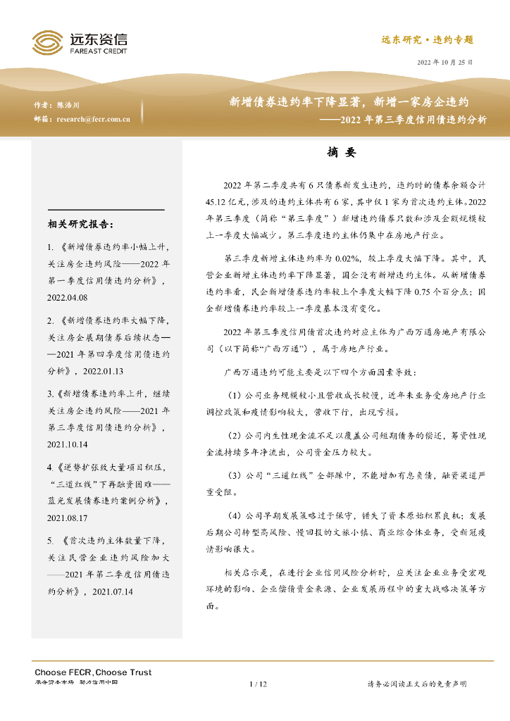 远东资信:新增债券违约率下降显著,新增一家房企违约——2022年第三季度信用债违约分析报告.pdf