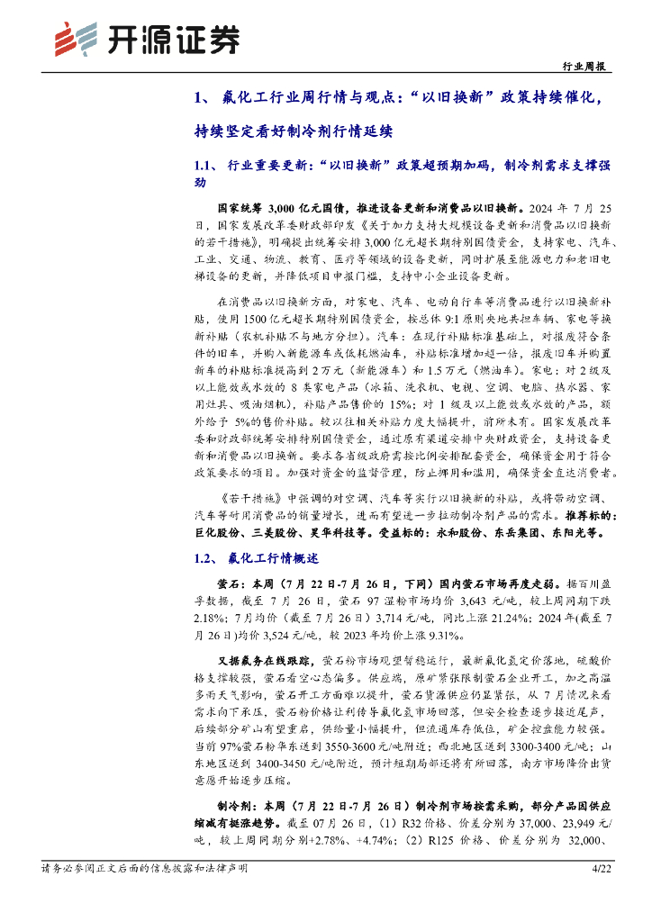 开源证券:化学原料行业周报:“以旧换新”政策超预期,无惧短期扰动,持续坚定看好制冷剂行情延续.pdf