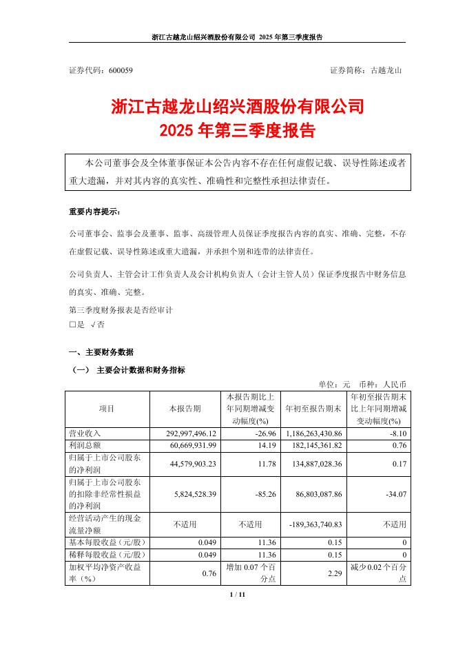 600059-古越龙山:古越龙山2025年第三季度报告.pdf