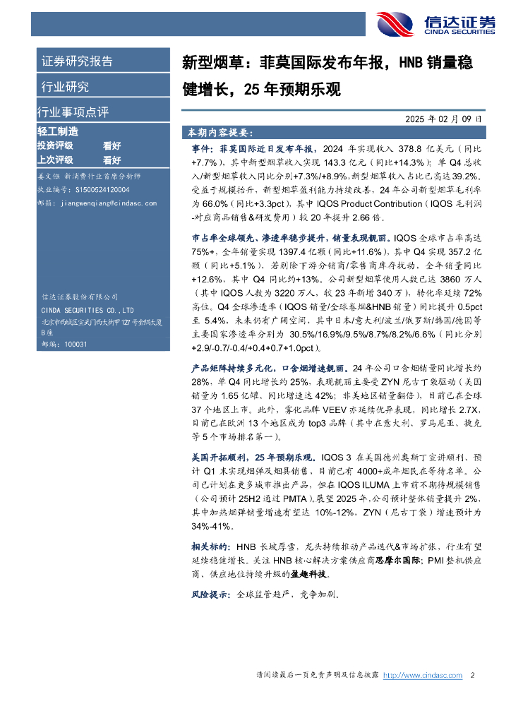 信达证券:新型烟草:菲莫国际发布年报,HNB销量稳健增长,25年预期乐观.pdf