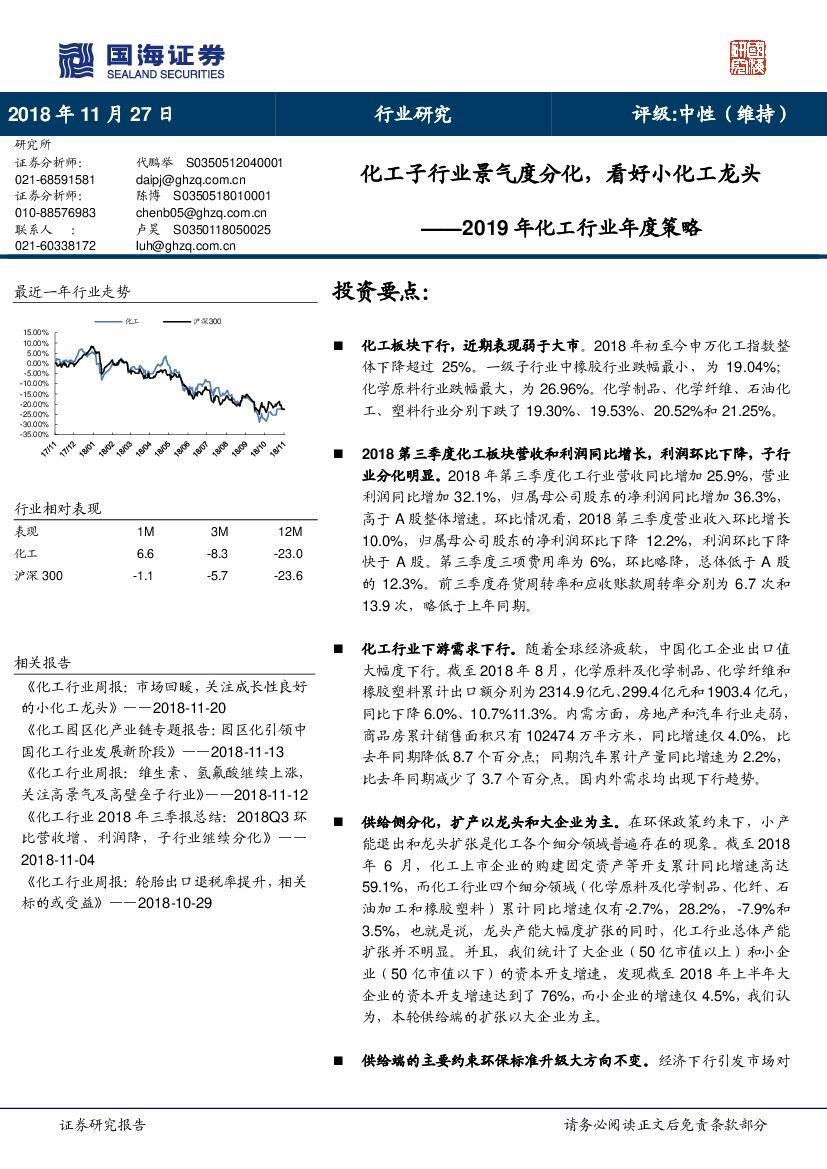 国海证券:2019年化工行业年度策略:化工子行业景气度分化,看好小化工龙头.pdf