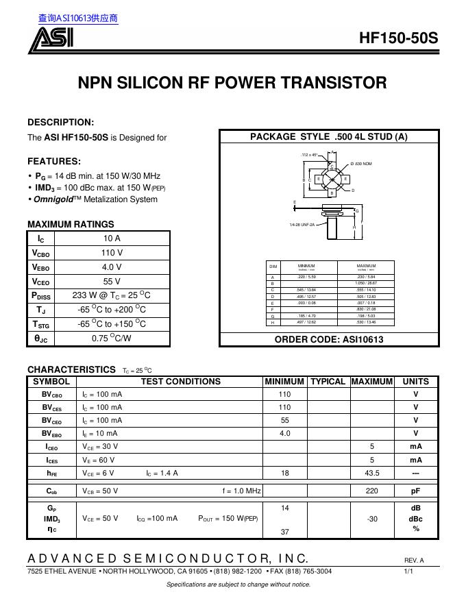 ASI HF150-50S NPN SILICON RF POWER TRANSISTOR 数据手册.pdf