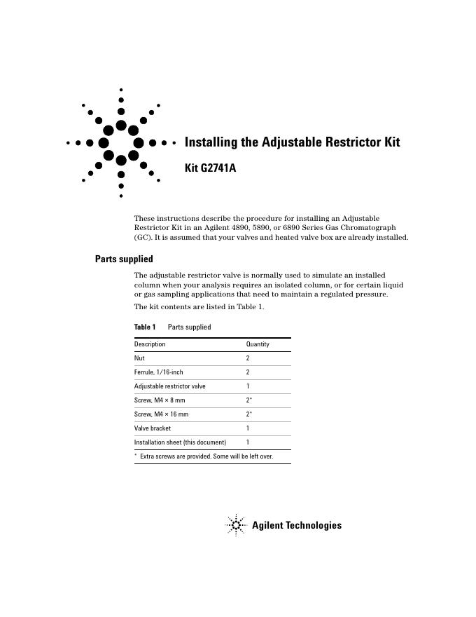 Agilent - Installing the Adjustable Restrictor Kit for the 6890, 5890 and 4890 GCs 说明书