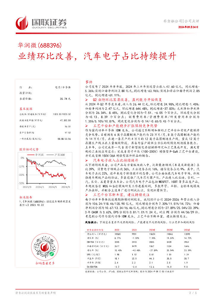 国联证券:华润微(688396)-业绩环比改善,汽车电子占比持续提升.pdf