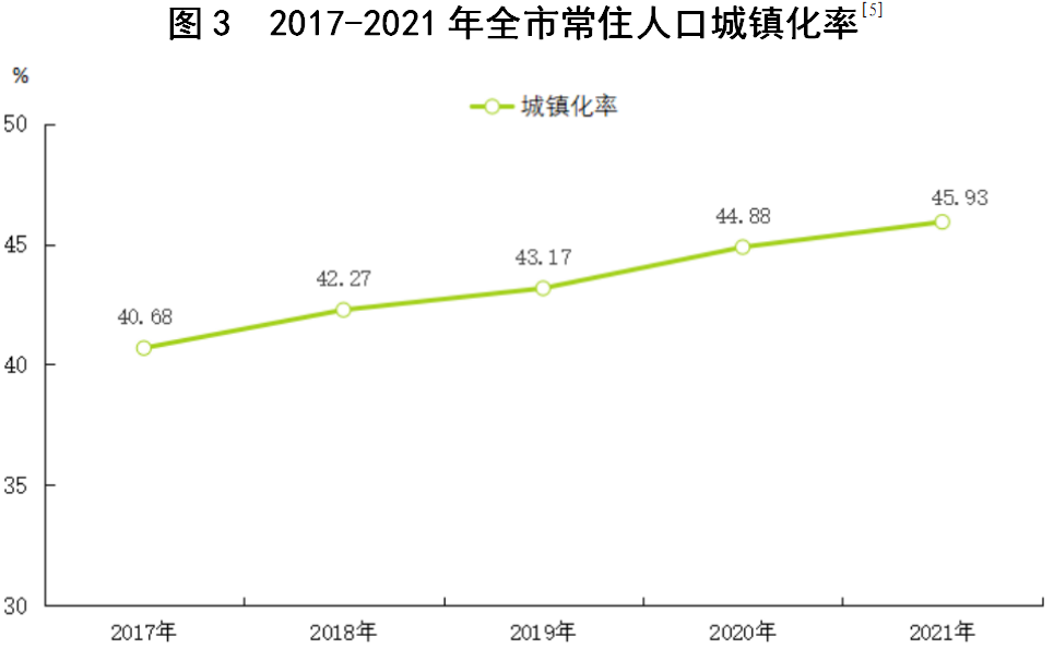 年末全市常住人口[4]341.91万人,比上年末减少0.32万人,其中城镇常住人口157.03万人,占常住人口比重(常住人口城镇化率)45.93%,比上年末提高1.05个百分点。全年出生人口3.35万人,出生率为9.96‰;死亡人口2.64万人,死亡率为7.70‰;自然增长率为2.26‰。