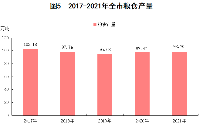 全年全市粮食总产量98.70万吨,比上年增加1.23万吨,增产1.3%。其中,春收粮食产量0.92万吨,增产13.9%;早稻产量15.73万吨,增产0.7%;秋粮产量48.61万吨,增产0.7%。全年谷物产量93.01万吨,比上年增产1.4%。其中,稻谷产量48.13万吨,增产1.1%;玉米产量44.46万吨,增产1.9%。