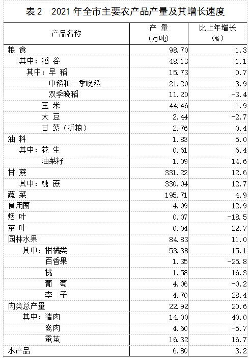 全年全市油料产量1.83万吨,比上年增产5.0%;甘蔗产量331.22万吨,增产12.6%。蔬菜产量(含食用菌)199.8万吨,增产5.1%。园林水果产量85.05万吨,增产17.7%。