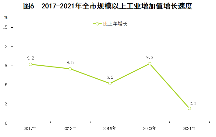 全年全部工业增加值比上年增长3.3%。规模以上工业增加值增长2.3%。在规模以上工业中,分经济类型看,国有控股企业增加值下降8.1%,股份制企业增长1.7%,外商及港澳台商投资企业增长11.9%;非公有工业企业增长12.7%。分门类看,采矿业增长29.6%,制造业增长11.3%,电力、热力、燃气及水生产供应业下降15.4%。