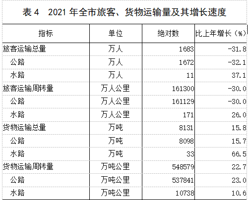 全年全市货物运输总量8131万吨,比上年增长15.8%。货物运输周转量548579万吨公里,增长22.7%。