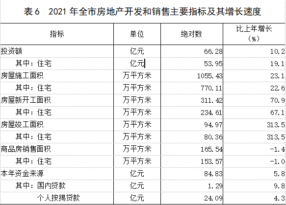 全年房地产开发投资66.28亿元,比上年增长10.2%。其中,商品住宅投资53.98亿元,增长19.1%;办公楼投资0.07亿元,下降80.1%;商业营业用房投资5.16亿元,下降42.0%。商品房销售面积165.54万平方米,下降1.4%。其中住宅153.57万平方米,下降1.0%。年末商品房待售面积45.51万平方米,比上年末减少0.55万平方米。其中,商品住宅待售面积18.84万平方米,增加0.05万平方米。
