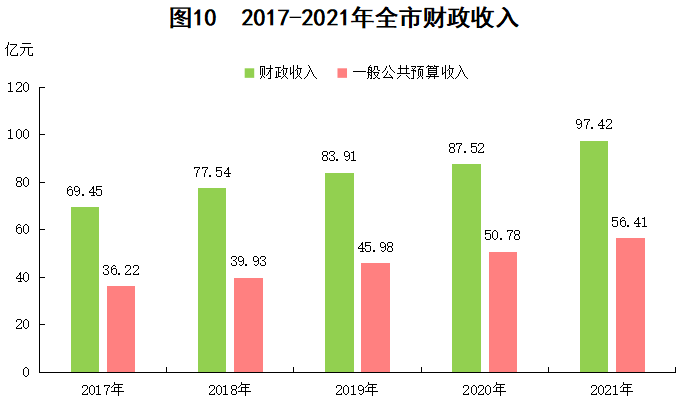 全年全市财政收入97.42亿元,比上年增长11.3%;一般公共预算收入56.41亿元,增长11.1%,其中税收收入29.93亿元,增长15.1%,占一般公共预算收入的比重为53.1%。一般公共财政预算支出374.73亿元,比上年下降17.1%,其中,民生支出311.46亿元,占一般公共财政预算支出的比重为83.1%。