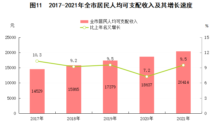 全年全市居民人均可支配收入20414元,比上年名义(下同)增长9.5%。按常住地分,城镇居民人均可支配收入33351元,比上年增长8.0%;农村居民人均可支配收入12325元,增长11.3%。城乡居民人均收入比为2.71:1,比上年缩小0.08。