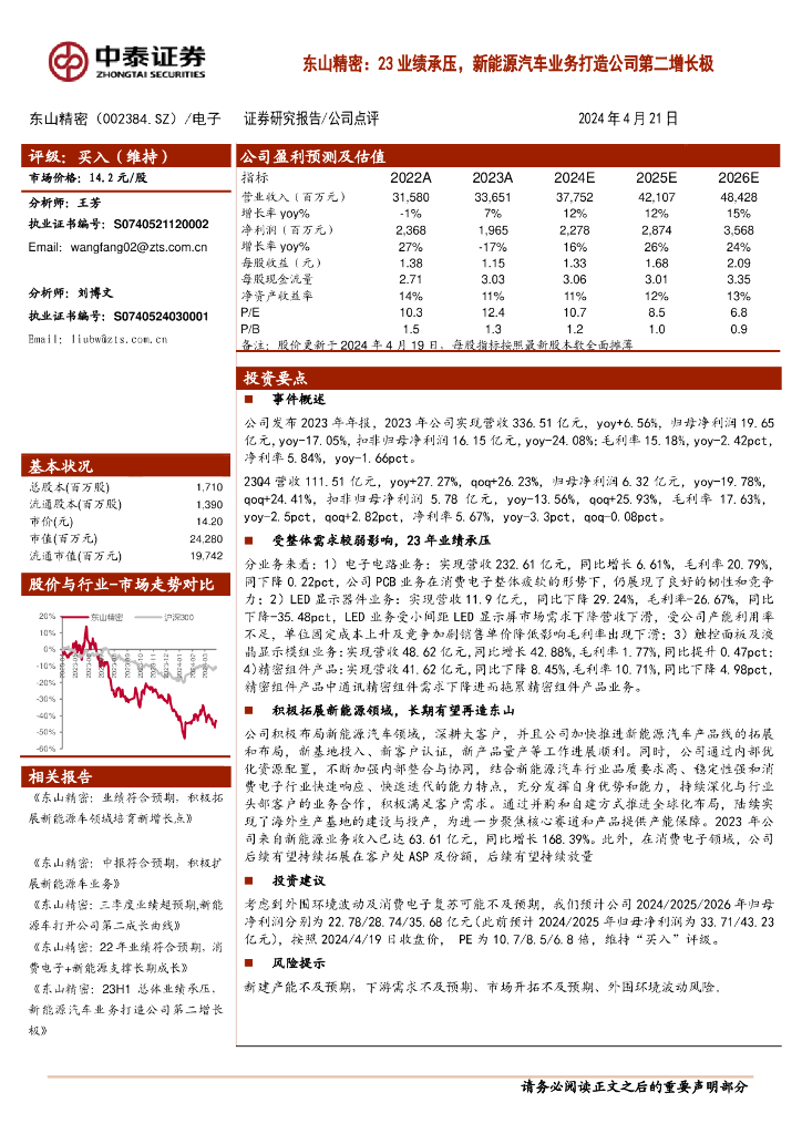 中泰证券:东山精密:23业绩承压,新能源汽车业务打造公司第二增长极.pdf