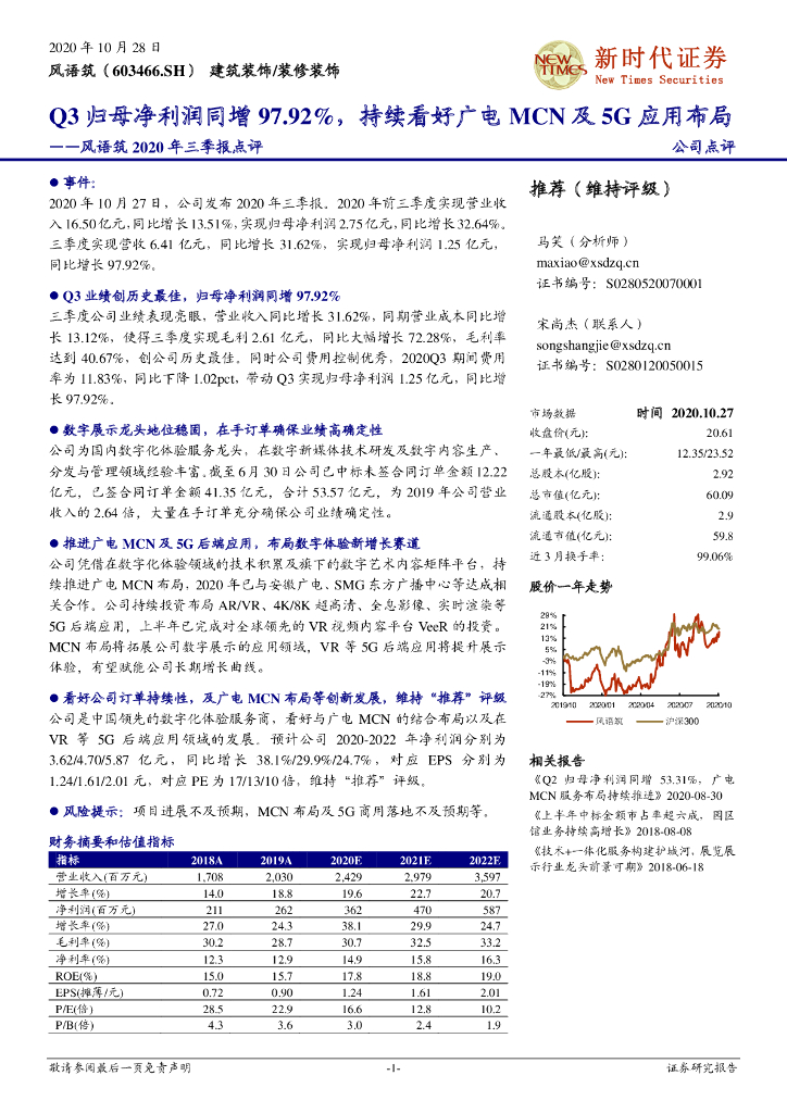 新时代证券:风语筑2020年三季报点评:Q3归母净利润同增97.92%,持续看好广电MCN及5G应用布局.pdf