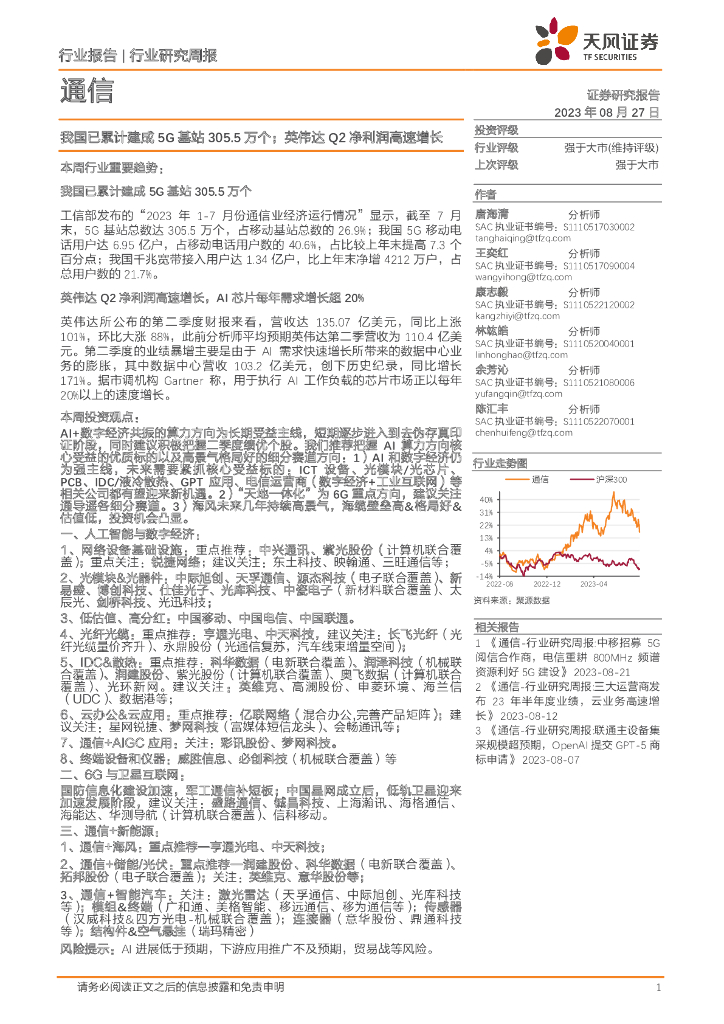 天风证券:通信行业研究周报:我国已累计建成5G基站305.5万个;英伟达Q2净利润高速增长.pdf