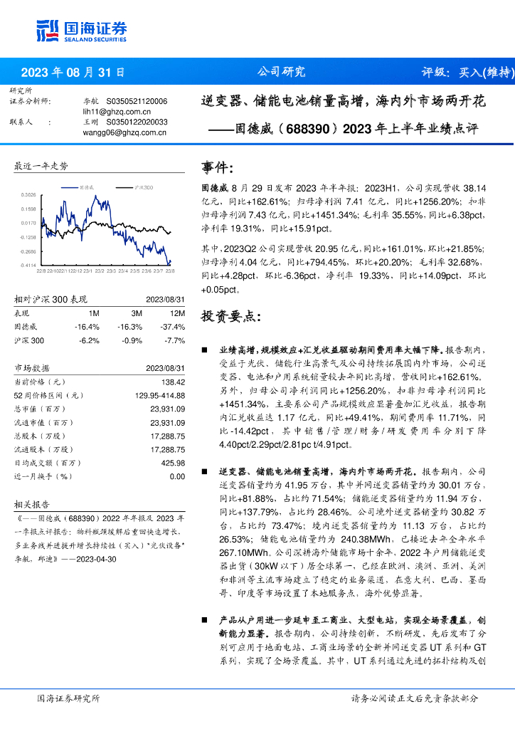 国海证券:固德威(688390)-2023年上半年业绩点评:逆变器、储能电池销量高增,海内外市场两开花.pdf